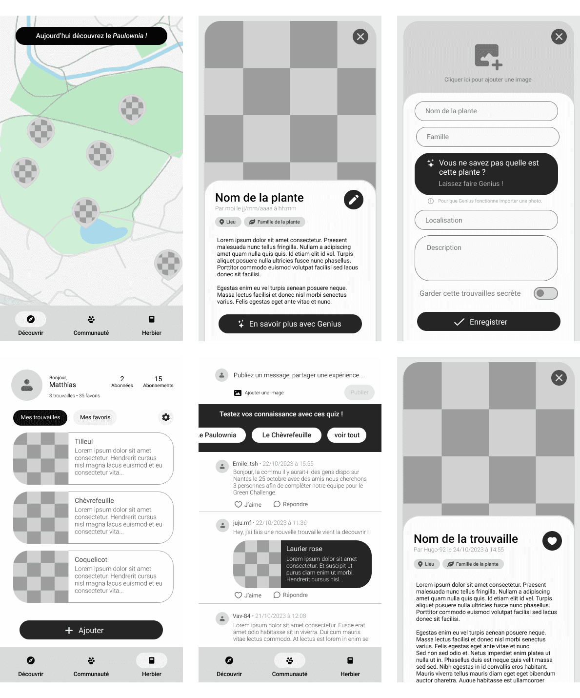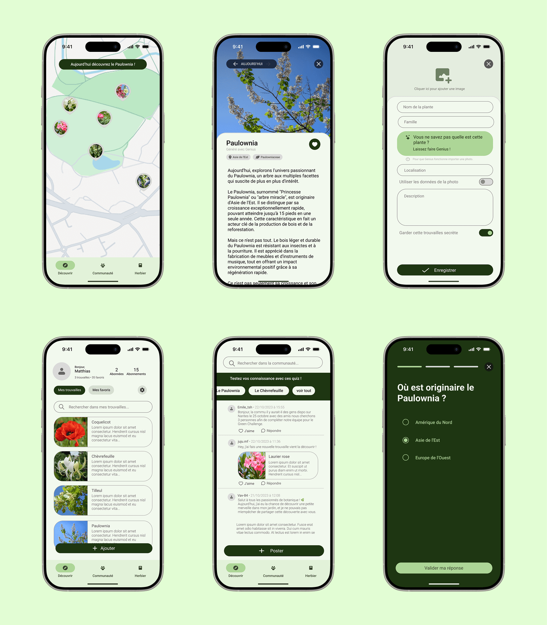 Ce projet a été réalisé dans le cadre du cours d’initation à Figma à L’École de Design Nantes Atlantique. Il s’agit ici d’un concept fictif. Il s'agit d'une application permettant de découvrir la nature et créer son herbier numérique.
